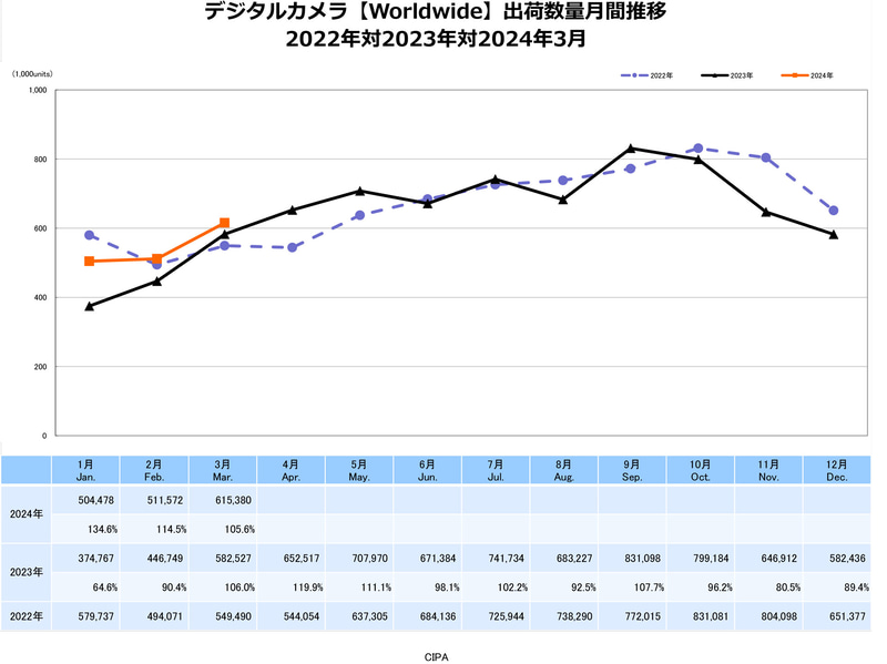 世界全体で「レンズ一体型カメラ」が好調を維持…CIPAの3月統計 未分類 Twitter Facebook はてブ Pocket LINE コピー 2024.05.01 一般社団法人カメラ映像機器工業会(CIPA)は4月25日(木)、2024年3月のデジタルカメラ生産出荷実績(同工業会統計)を公開した。
