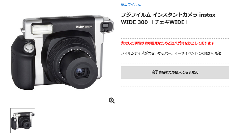 FUJIFILM instax WIDE 300 が生産完了 未分類 Twitter Facebook はてブ Pocket LINE コピー 2024.05.28 富士フイルムのインスタントカメラ「instax WIDE 300」が小売店で生産完了・販売終了。4月より供給不足で受注を停止していた製品ですが、そのままディスコンとなるのでしょうか。